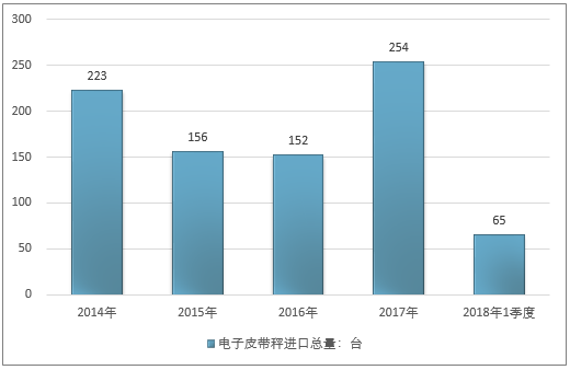 2016年我国电子皮带秤进口总量152台 ,2017年进口总量254台 ;2019年1季度进口总量65台 。