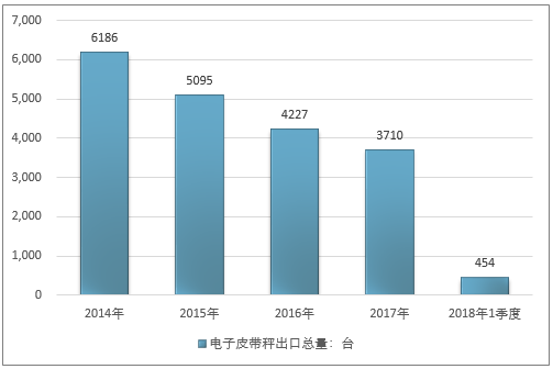 2016年我国电子皮带秤出口总量4227台 ,2017年出口总量3710台 ;2019年1季度出口总量454台 。
