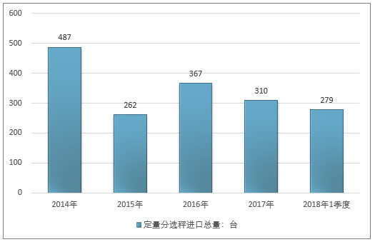 2016年我国定量分选秤进口总量367台 ,2017年进口总量310台 ;2019年1季度进口总量279台 。