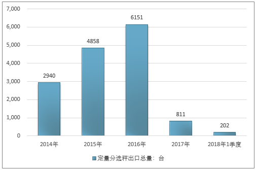 2016年我国定量分选秤出口总量6151台 ,2017年出口总量811台 ;2019年1季度出口总量202台 。