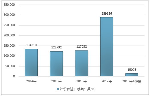 2016年我国计价秤进口总额127052美元,2017年进口总额289126美元;2019年1季度进口总额15025美元。