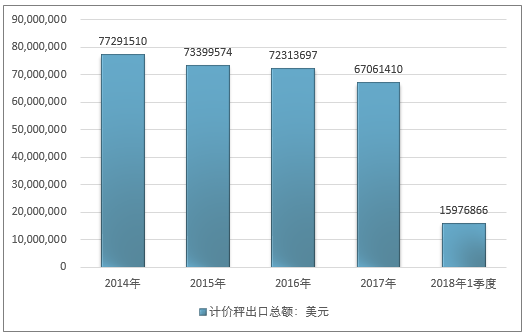 2016年我国计价秤出口总额72313697美元,2017年出口总额67061410美元;2019年1季度出口总额15976866美元。