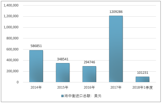 2016年我国地中衡进口总额294746美元,2017年进口总额1209286美元;2019年1季度进口总额101231美元。