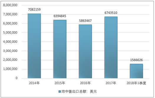 2016年我国地中衡出口总额5863467美元,2017年出口总额6743510美元;2019年1季度出口总额1566626美元。