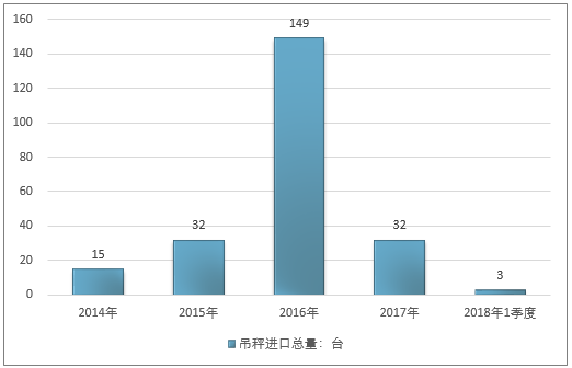 2016年我国吊秤进口总量149台 ,2017年进口总量32台 ;2019年1季度进口总量3台 。