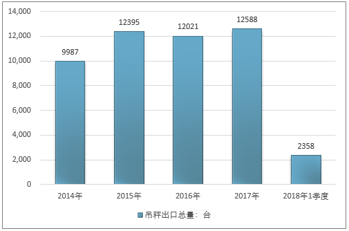 2016年我国吊秤出口总量12021台 ,2017年出口总量12588台 ;2019年1季度出口总量2358台 。