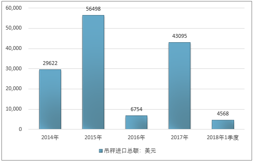 2016年我国吊秤进口总额6754美元,2017年进口总额43095美元;2019年1季度进口总额4568美元。