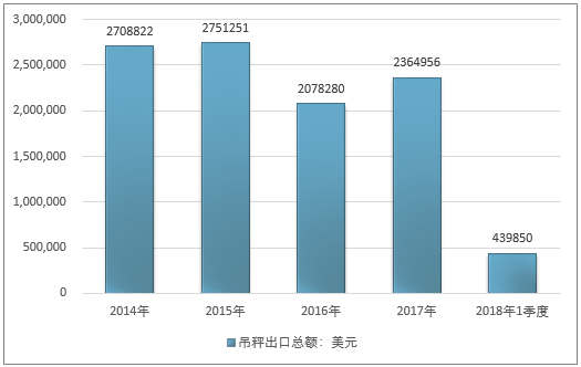 2016年我国吊秤出口总额2078280美元,2017年出口总额2364956美元;2019年1季度出口总额439850美元。