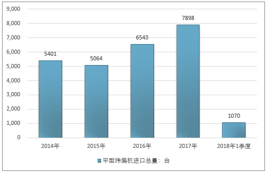 2016年我国平型纬编机进口总量6543台,2017年进口总量7898台;2019年1季度进口总量1070台。