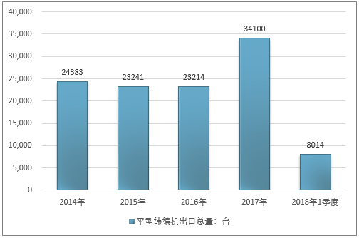 2016年我国平型纬编机出口总量23214台,2017年出口总量34100台;2019年1季度出口总量8014台。