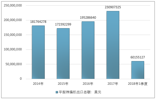 2016年我国平型纬编机出口总额195286640美元,2017年出口总额230907325美元;2019年1季度出口总额60155127美元。
