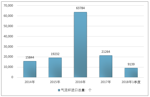 2016年我国气流杯进口总量63784个,2017年进口总量21264个;2019年1季度进口总量9139个。