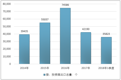 2016年我国接、投梭箱出口总量74586个,2017年出口总量42190个;2019年1季度出口总量35823个。
