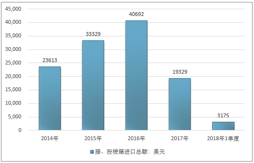 2016年我国接、投梭箱进口总额40692美元,2017年进口总额19329美元;2019年1季度进口总额3175美元。
