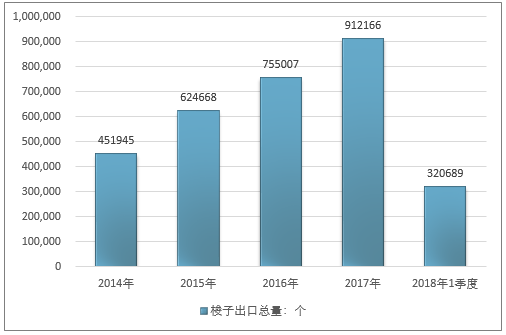 2016年我国梭子出口总量755007个,2017年出口总量912166个;2019年1季度出口总量320689个。