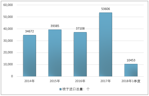 2016年我国梭子进口总量37108个,2017年进口总量53606个;2019年1季度进口总量10453个。