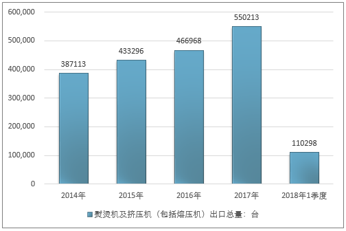2016年我国熨烫机及挤压机(包括熔压机)出口总量466968台,2017年出口总量550213台;2019年1季度出口总量110298台。
