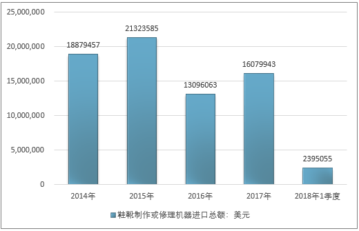 2016年我国鞋靴制作或修理机器进口总额13096063美元,2017年进口总额16079943美元;2019年1季度进口总额2395055美元。