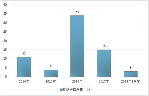2016年我国转炉进口总量34台,2017年进口总量15台;2019年1季度进口总量3台。