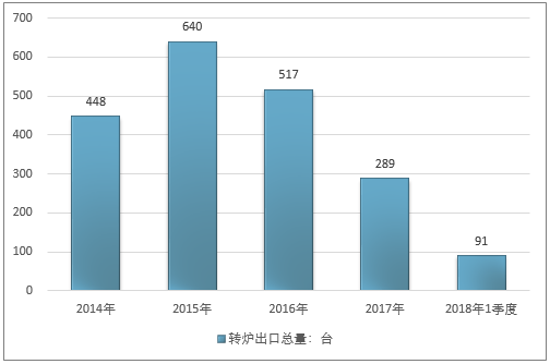 2016年我国转炉出口总量517台,2017年出口总量289台;2019年1季度出口总量91台。