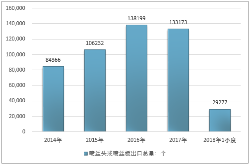 2016年我国喷丝头或喷丝板出口总量138199个,2017年出口总量133173个;2019年1季度出口总量29277个。
