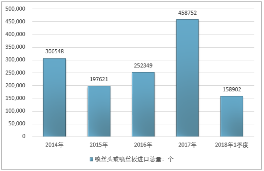 2016年我国喷丝头或喷丝板进口总量252349个,2017年进口总量458752个;2019年1季度进口总量158902个。