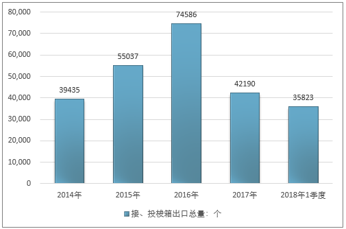 2016年我国接、投梭箱出口总量74586个,2017年出口总量42190个;2019年1季度出口总量35823个。