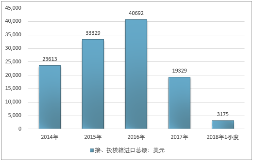 2016年我国接、投梭箱进口总额40692美元,2017年进口总额19329美元;2019年1季度进口总额3175美元。