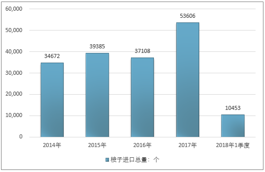 2016年我国梭子进口总量37108个,2017年进口总量53606个;2019年1季度进口总量10453个。