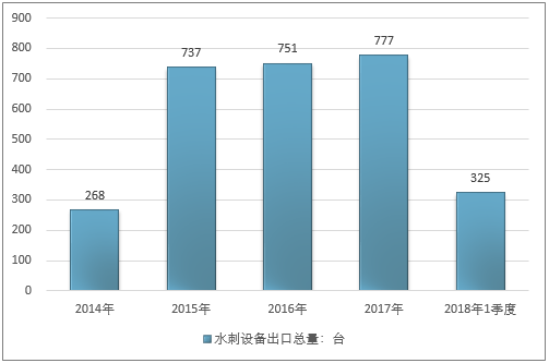2016年我国水刺设备出口总量751台,2017年出口总量777台;2019年1季度出口总量325台。