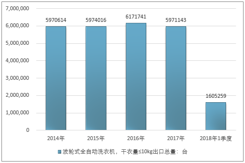 2016年我国波轮式全自动洗衣机,干衣量≤10kg出口总量6171741台,2017年出口总量5971143台;2019年1季度出口总量1605259台。