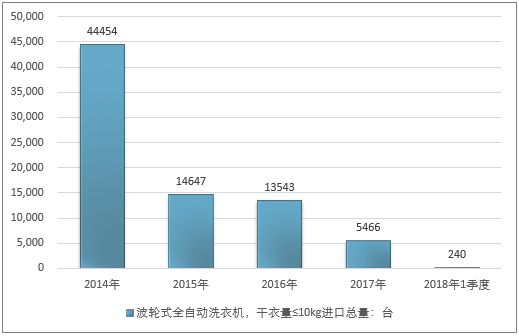 2016年我国波轮式全自动洗衣机,干衣量≤10kg进口总量13543台,2017年进口总量5466台;2019年1季度进口总量240台。