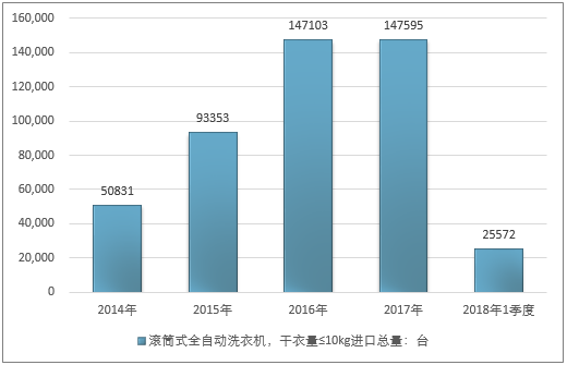 2016年我国滚筒式全自动洗衣机,干衣量≤10kg进口总量147103台,2017年进口总量147595台;2019年1季度进口总量25572台。