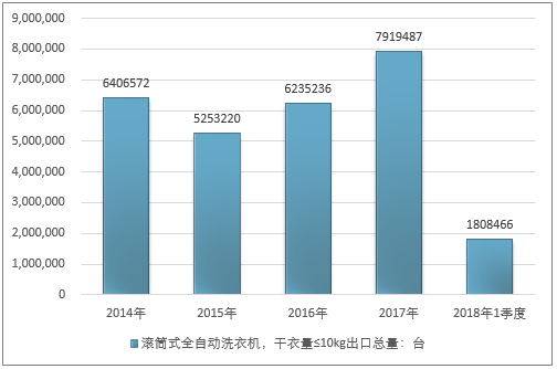 2016年我国滚筒式全自动洗衣机,干衣量≤10kg出口总量6235236台,2017年出口总量7919487台;2019年1季度出口总量1808466台。