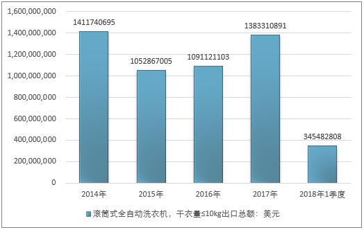 2016年我国滚筒式全自动洗衣机,干衣量≤10kg出口总额1091121103美元,2017年出口总额1383310891美元;2019年1季度出口总额345482808美元。