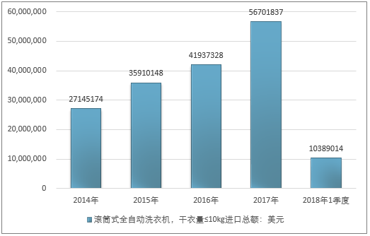2016年我国滚筒式全自动洗衣机,干衣量≤10kg进口总额41937328美元,2017年进口总额56701837美元;2019年1季度进口总额10389014美元。
