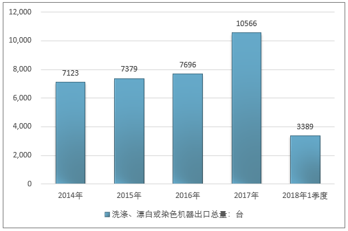 2016年我国洗涤、漂白或染色机器出口总量7696台,2017年出口总量10566台;2019年1季度出口总量3389台。