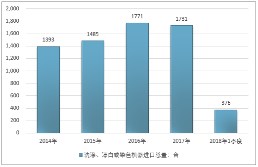 2016年我国洗涤、漂白或染色机器进口总量1771台,2017年进口总量1731台;2019年1季度进口总量376台。