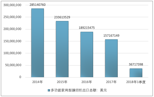 2016年我国多功能家用型缝纫机出口总额189215475美元,2017年出口总额157167149美元;2019年1季度出口总额36717398美元。
