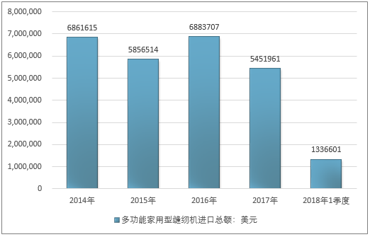 2016年我国多功能家用型缝纫机进口总额6883707美元,2017年进口总额5451961美元;2019年1季度进口总额1336601美元。