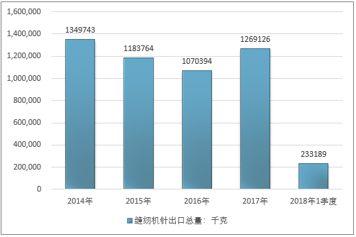 2016年我国缝纫机针出口总量1070394千克,2017年出口总量1269126千克;2019年1季度出口总量233189千克。