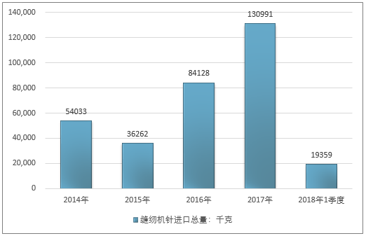 2016年我国缝纫机针进口总量84128千克,2017年进口总量130991千克;2019年1季度进口总量19359千克。