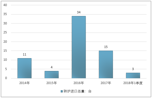 2016年我国转炉进口总量34台,2017年进口总量15台;2019年1季度进口总量3台。