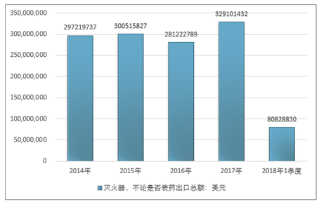 2016年我国灭火器,不论是否装药出口总额281222789美元,2017年出口总额329101432美元;2019年1季度出口总额80828830美元。