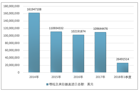 2016年我国喷枪及类似器具进口总额102191874美元,2017年进口总额109644476美元;2019年1季度进口总额26491514美元。