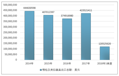 2016年我国喷枪及类似器具出口总额374916980美元,2017年出口总额423521411美元;2019年1季度出口总额120525620美元。