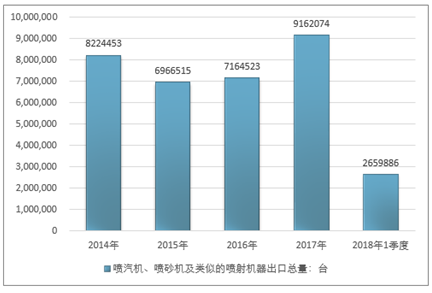 2016年我国喷汽机、喷砂机及类似的喷射机器出口总量7164523台,2017年出口总量9162074台;2019年1季度出口总量2659886台。