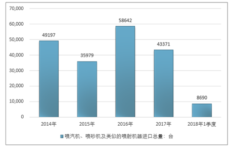 2016年我国喷汽机、喷砂机及类似的喷射机器进口总量58642台,2017年进口总量43371台;2019年1季度进口总量8690台。
