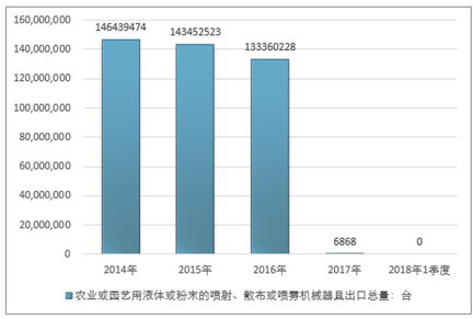 2016年我国农业或园艺用液体或粉末的喷射、散布或喷雾机械器具出口总量133360228台,2017年出口总量6868台;2019年1季度出口总量-台。