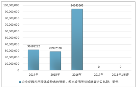 2016年我国农业或园艺用液体或粉末的喷射、散布或喷雾机械器具进口总额94343665美元,2017年进口总额-美元;2019年1季度进口总额-美元。